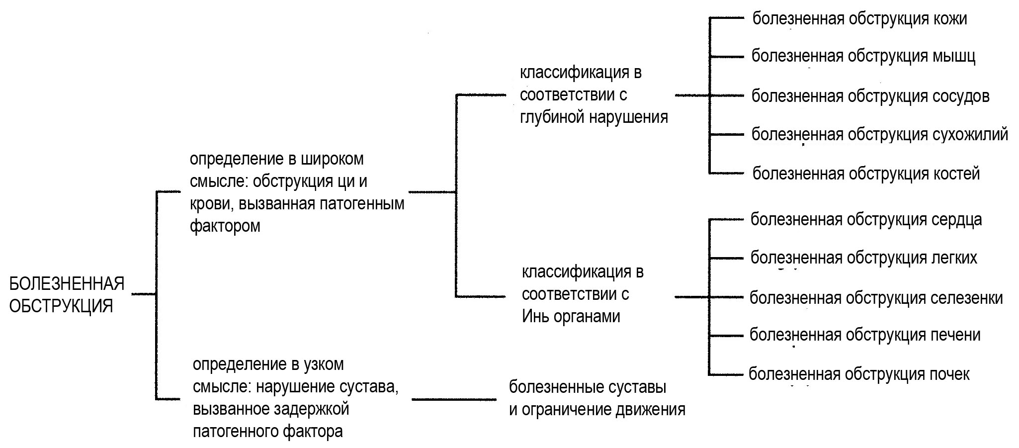 Поскольку общий тип болезненной обструкции относится к расстройствам на многих разных уровнях по всему телу, общая картина далее разделена на две широкие категории: первая основана на глубине поражения тканей, вторая — на проникновении в органы Инь.