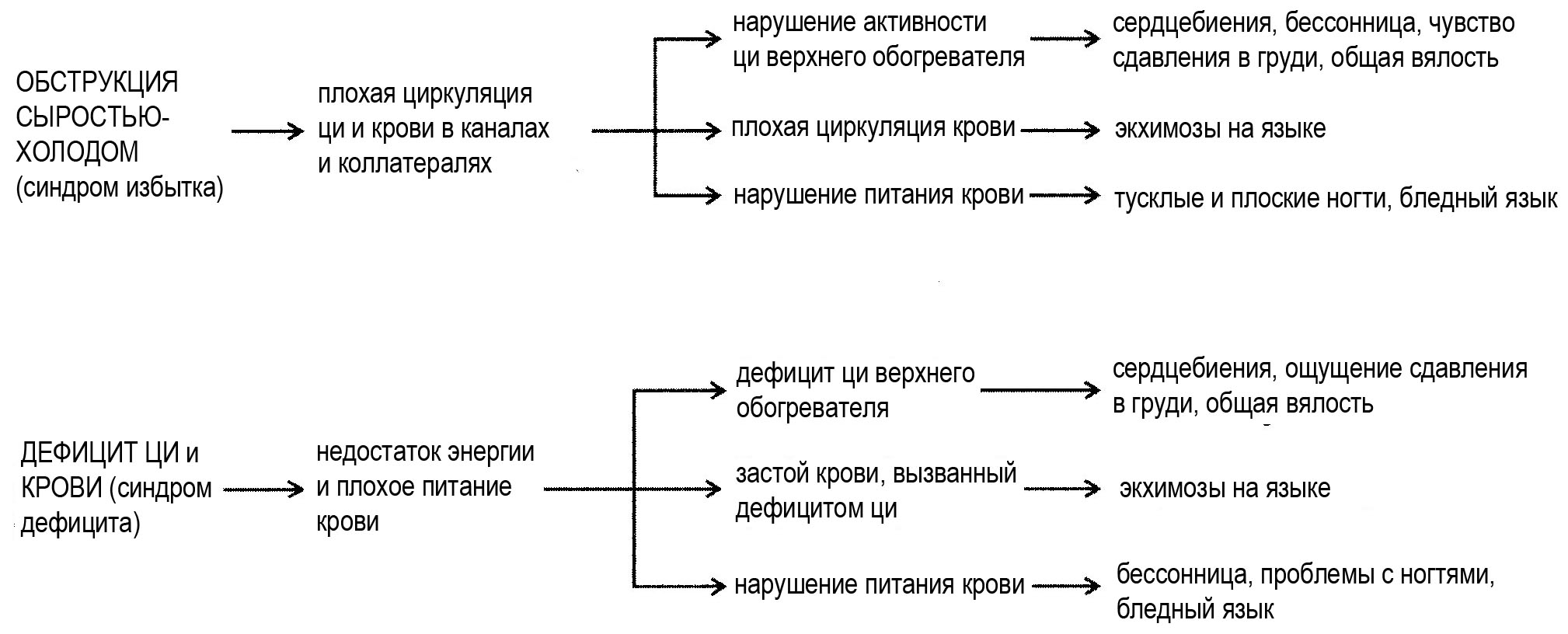сочетание канала-коллатерали и внутренних, холодовых, а также избыточных и дефицитных синдромов. Избыток — главная проблема.