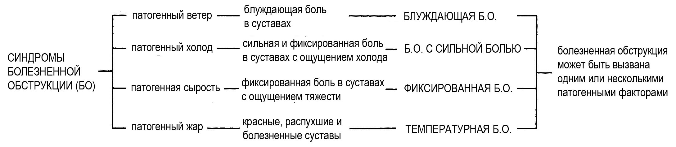 Основная теория случая: болезненная обструкция в узком смысле подразумевает вторжение в суставы внешних патогенных факторов. Она характеризуется локальной обструкцией ци и крови, приводящей к болям в суставах и ограничению движения. Симптомы различаются в зависимости от вовлеченных патогенных факторов: