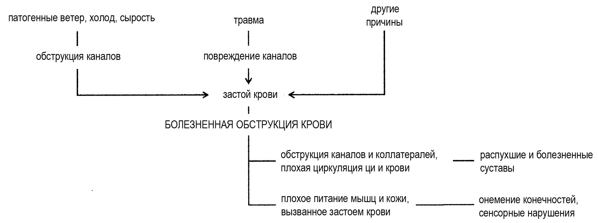 Основное патологическое изменение — это плохая циркуляция, приводящая к недостаточному питанию мышц и кожи. Основной проблемой является застой крови; соответственно, в клинической ситуации боль в суставах, вызванная застоем крови, обычно называется болезненной непроходимостью крови. Эта категория включает как травму, так и вторжение патогенных факторов, вызывающих застой крови. У некоторых пациентов с такими симптомами нет истории провоцирующих факторов; они также включены в эту группу.
