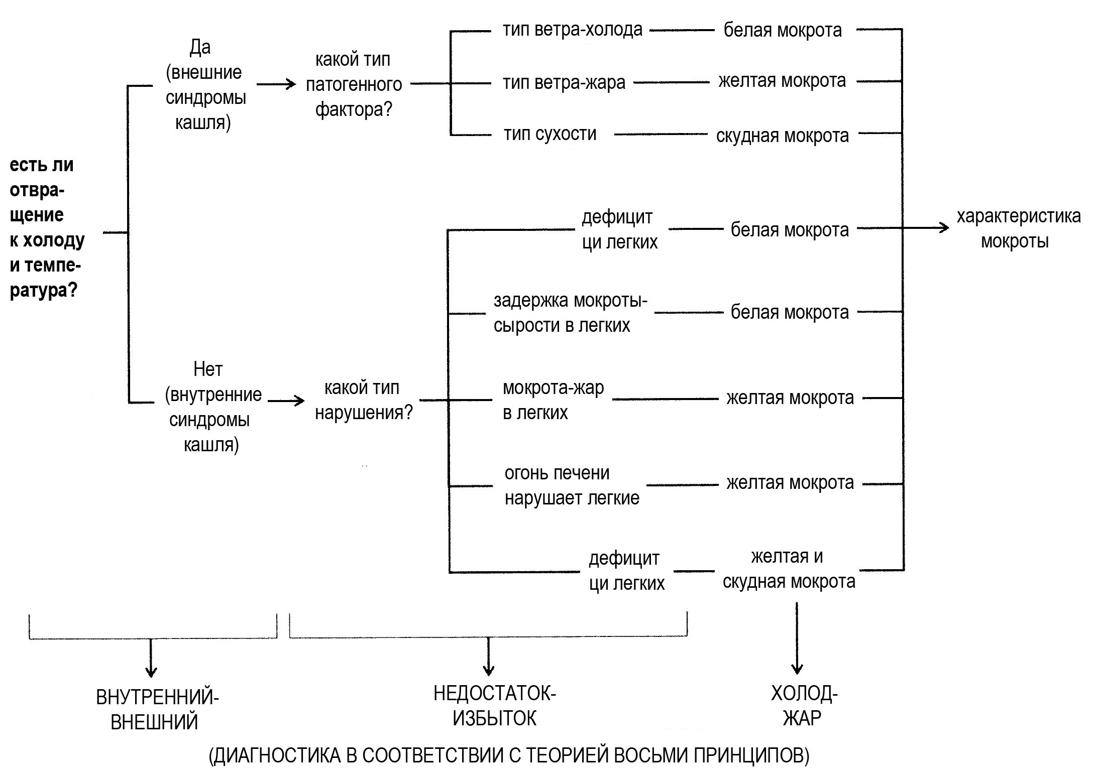 Эта процедура в основном следует диагностической теории восьми принципов, согласно которым различают, является ли синдром внутренним или внешним, недостаточным или избыточным, холодным или жарким: