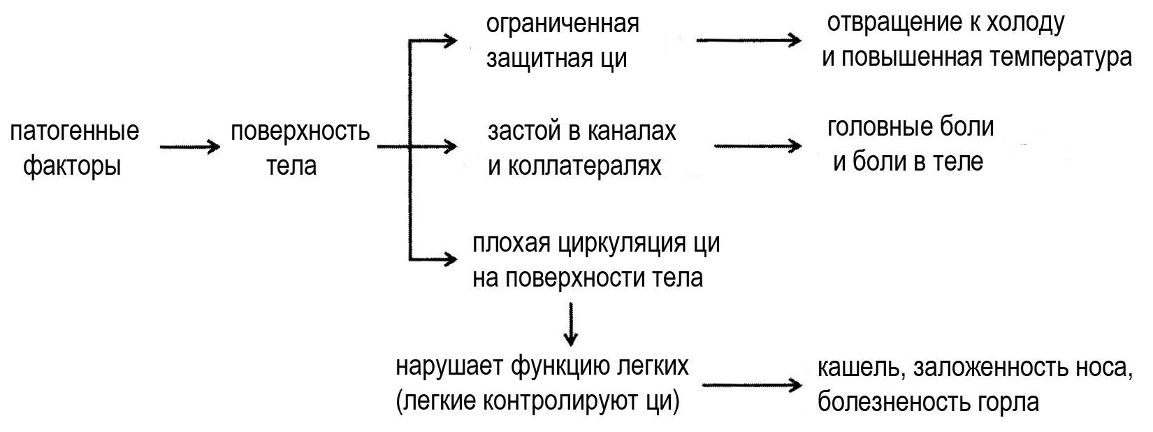 Патогенные факторы на поверхности блокируют каналы, особенно коллатерали, а также влияют на ци легких, что приводит к общей боли, заложенности носа, боли в горле и кашлю. Налет на языке остается тонким, а пульс плавающим, потому что патогенные факторы находятся только на поверхности и не имеют влияния на функционирование органов.