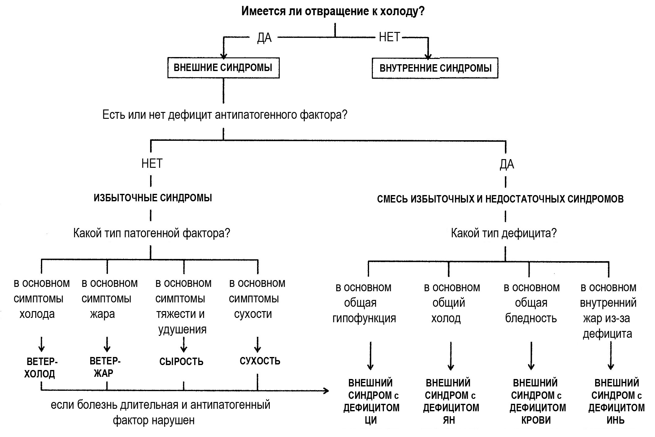 Это важно, поскольку при наличии внешнего синдрома первым принципом лечения в китайской медицине является устранение патогенных факторов. Вся процедура диагностики внешних синдромов показана на Рис. 9.