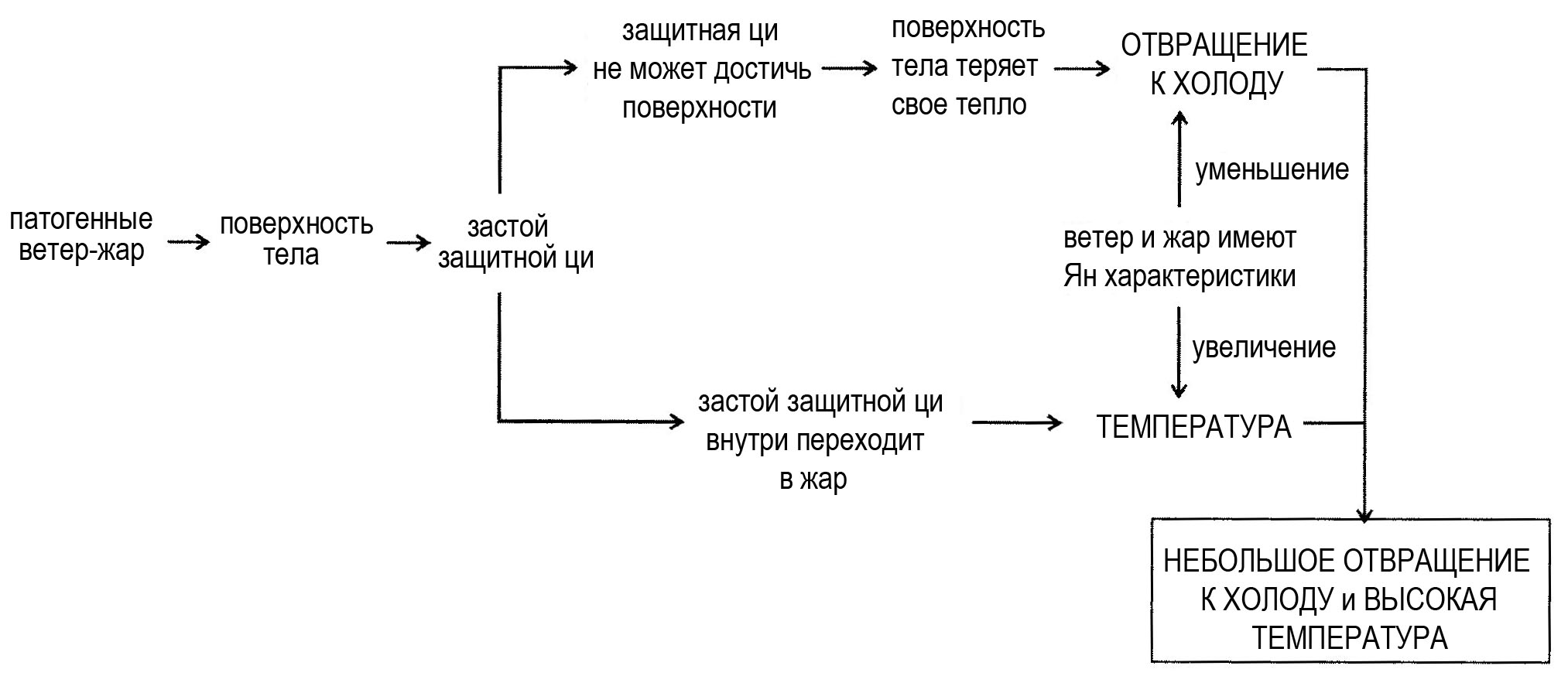 У пациента есть легкое отвращение к ветру и холоду, что может вызвать некоторую путаницу, поскольку патогенный фактор в данном случае включает жар. Решающим моментом является то, что этот патогенный жар, который занимает поверхность тела, мешает естественной защитной ци достичь её. Защитная ци застаивается и ограничивается на более глубоком уровне (как в предыдущем случае), и её функция согревания и рассеивания тем самым нарушается. Ветер-жар является янским патогенным фактором, который изменит отвращение пациента к холоду, но не будет играть ту же роль, что и естественная защитная ци организма.
