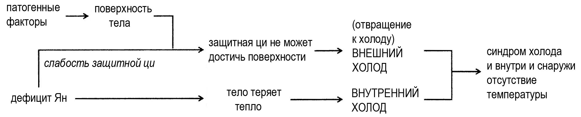 В этом конкретном случае у пациентки дефицит Ян, поэтому сопротивление организма слишком слабое, чтобы изгнать патогенные факторы. В то же время, однако, поскольку есть внутренний холод, нет причин для того, чтобы симптомы трансформировались в синдром жара. Таким образом, возникает патовая ситуация, в которой патогенные факторы сохраняются на поверхности тела, а дефицит Ян не улучшается.