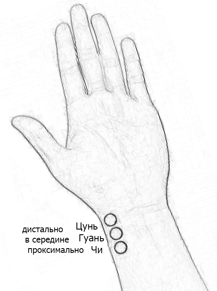 Рис. 2.8 Положение пальцев при трех позициях пульса. Дистальное расположение соответствует Цунь, среднее — Гуань и проксимальное — Чи.