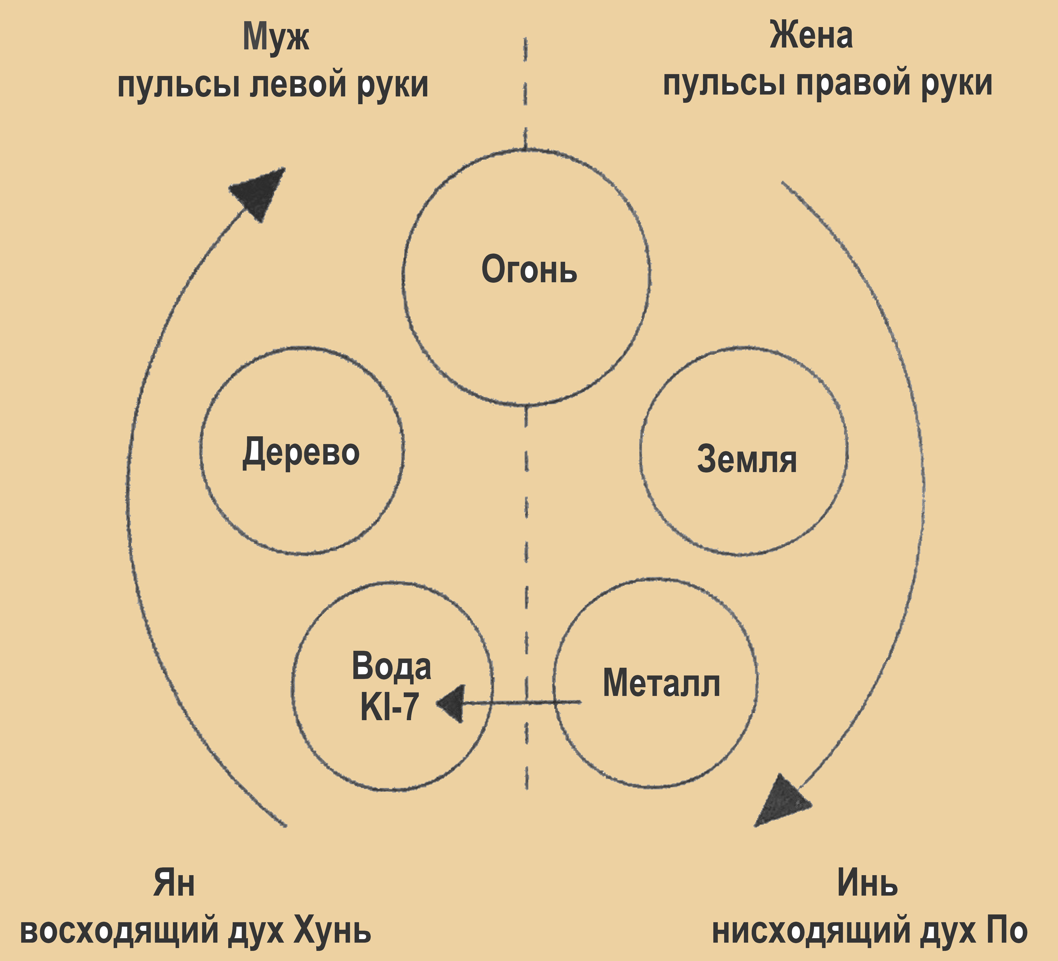 В системе пяти элементов пульсации на правой руке соответствуют Огню (перикарду и трем обогревателям), Земле и Металлу. Направление движения – от вершины жизни (Огня-лета) вниз, через изобилие урожая, и, наконец, к возвращению к истокам, опосредованному Металлом. Это движение энергии соответствует нисходящему движению духа Инь – По [63], возвращающегося к Земле, откуда он и пришел.